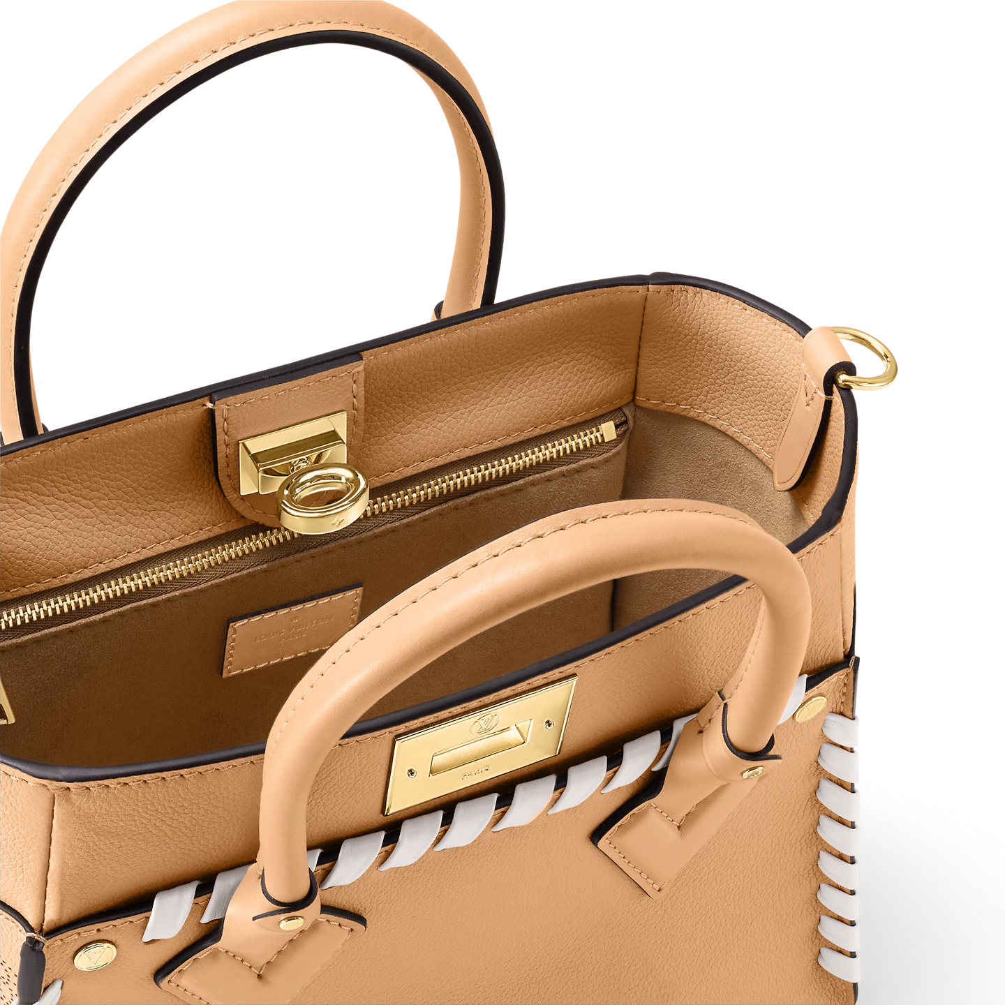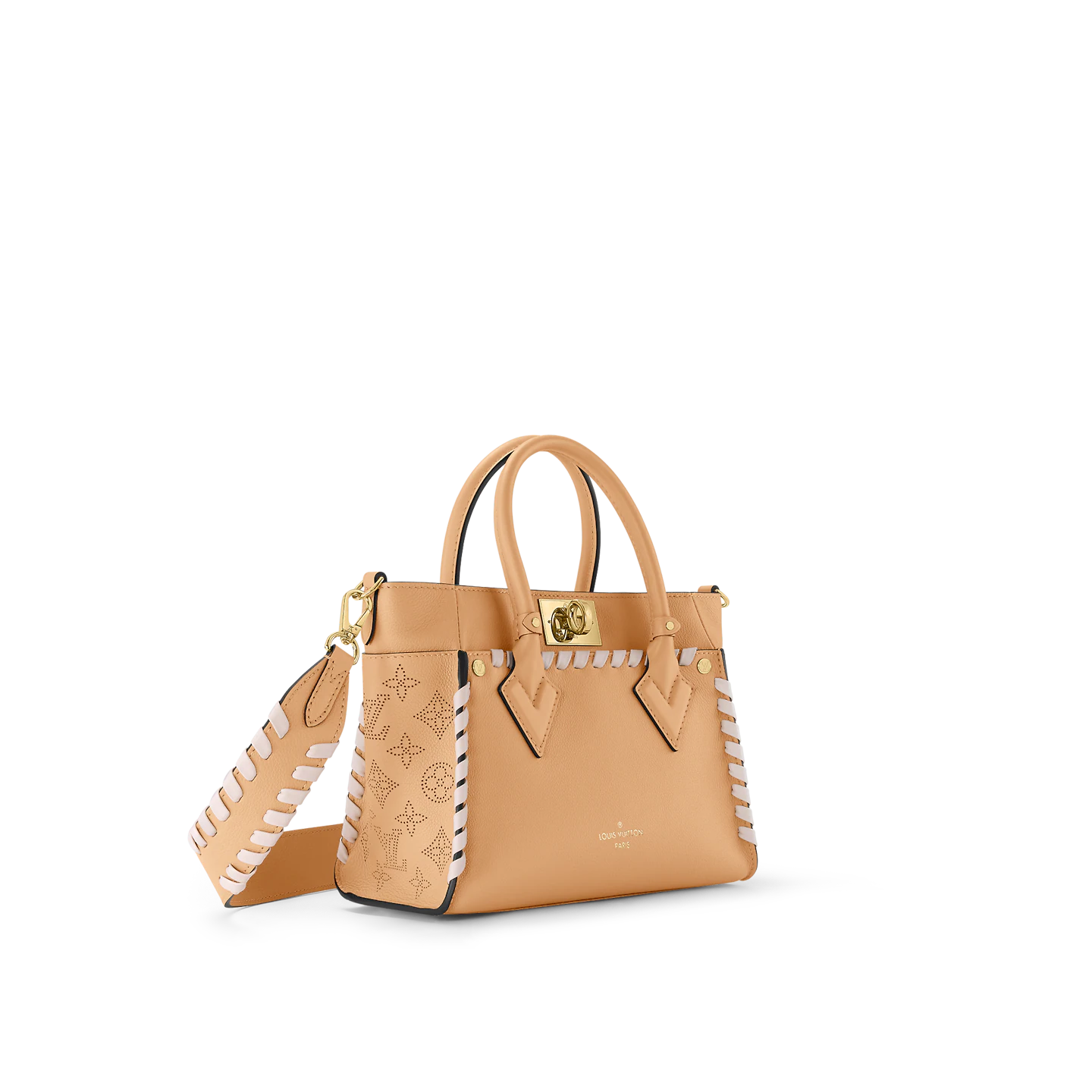 Crafted from supple calf leather. with a perforated pattern of Monogram Flowers and LVs on the sides. this On My Side PM handbag features hand-braided detailing. on the front. back and on the leather strap. Structured enough to wear with business or dress clothes. it brings style to any casual look.